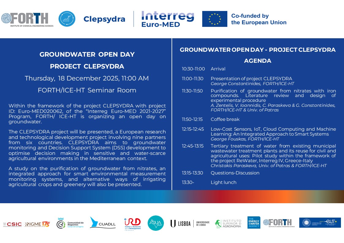 FORTH/ICE-HT organized the Groundwater Open Day on 18 December 2025 at the Seminar Room of the facility of the Institute. The main objectives of the event were to raise groundwater awareness and to present the CLEPSYDRA Project. Invitations were sent by e-mails and the invitation/agenda was published on LinkedIn and the website of the Institute.