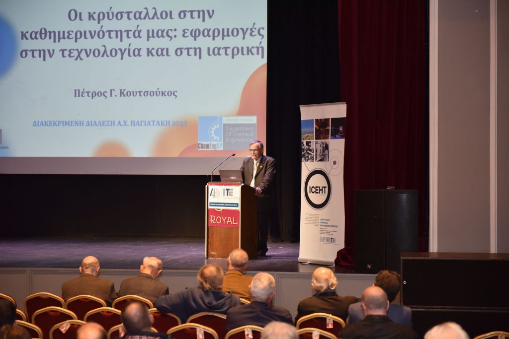 The 12th “Alkiviades Ch. Payatakes” Distinguished Lecture event of FORTH/ICE-HT was organized this year on Monday December 4 at the Royal Theater in Patras. Distinguished lecturer was Professor Emeritus of Department of Chemical Engineering of University of Patras Petros Koutsoukos, who is also Honorary Fellow of FORTH/ICE-HT since 2018, and its Acting Director for the period 2005-2007 & Vice-Director of the Institute (1995-1999, 2004-2006, 2015-2023). His talk was titled “Crystals in everyday life: Applications in Technology and Medicine”.