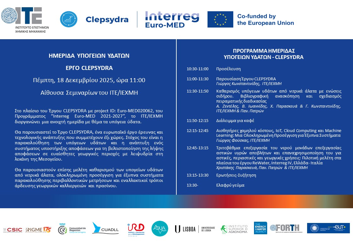 Το ΙΤΕ/ΙΕΧΜΗ διοργάνωσε ανοιχτή ημερίδα με θέμα τα Υπόγεια Ύδατα την Πέμπτη, 18 Δεκεμβρίου 2025 στην Αίθουσα Σεμιναρίων των εγκαταστάσεων του Ινστιτούτου στο πλαίσιο του Έργου CLEPSYDRA. Οι κύριοι στόχοι της εκδήλωσης ήταν η ευαισθητοποίηση του κοινού για τα υπόγεια ύδατα και η παρουσίαση του Έργου CLEPSYDRA. H πρόσκληση δημοσιεύτηκε στο LinkedIn και στην ιστοσελίδα του Ινστιτούτου και προσωπικές προσκλήσεις στάλθηκαν μέσω e-mail.